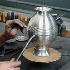 Zinn hat eine Eigenschaft, die vielen Menschen unserer Zeit fehlt: Zinn braucht Zeit und in hohem Maß Geduld. Die muss ein Zinngießer mitbringen. Langsam und stetig muss er die Form füllen, vorsichtig und mit viel Ausdauer kühlen, um einen festen, gebrauchstüchtigen Guss zu erzeugen. Zinn widersetzt sich modernen schnellen Verfahren, mit denen nur kurzzeitige Effekte erzielt werden können. Darum muss der Zinngießer die alten handwerklichen Methoden beherrschen, bei denen die Hand das wichtigste Werkzeug bleibt.